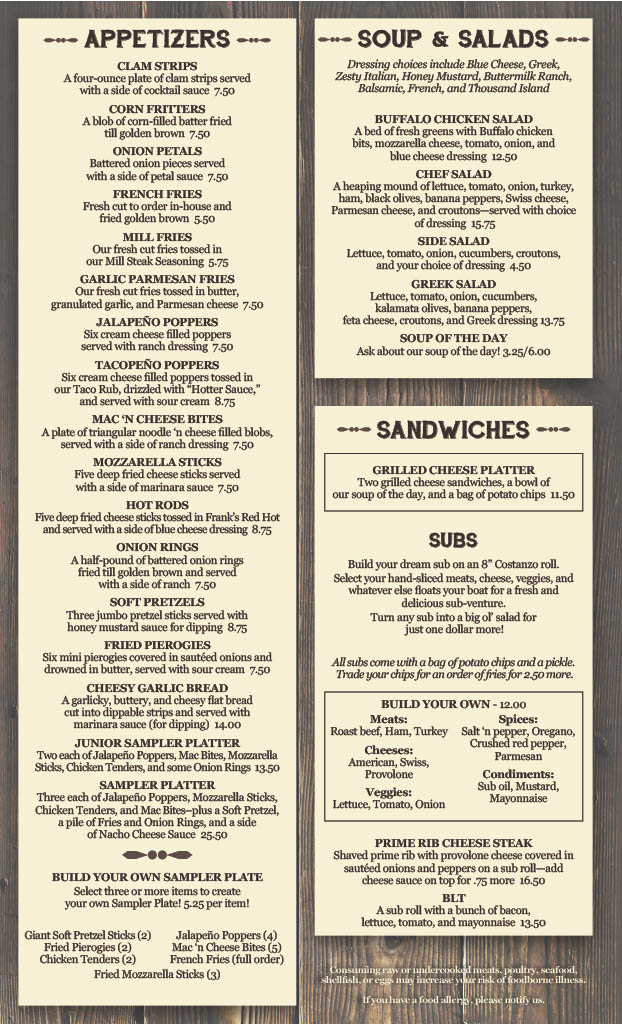 “ It’s been a few days since we’ve been to The Old Mill Inn, and I’m still thinking about the wings. They were excellent! The menu had a great variety of food and the restaurant itself has cool, what we call “I Spy” items on the wall and on shelves. There’s also a pool table and arcade upstairs. With Alfred State and University close by, The Old Mill Inn is definitely a great place to eat. ”